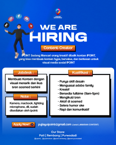 BERGABUNGLAH DENGAN TEAM iPoint Store! iPoint Store kini membuka kesempatan emas untuk bergabung dengan tim dinamis kami! Kami mencari individu-individu berbakat yang siap berkembang bersama